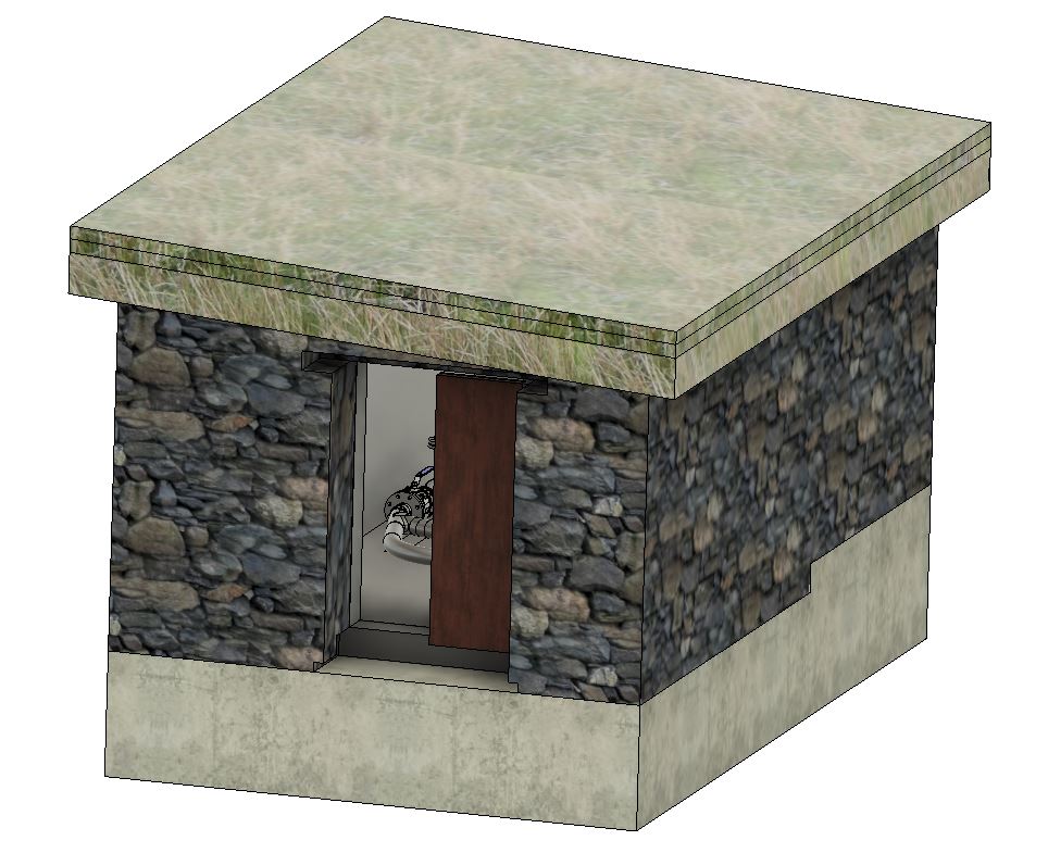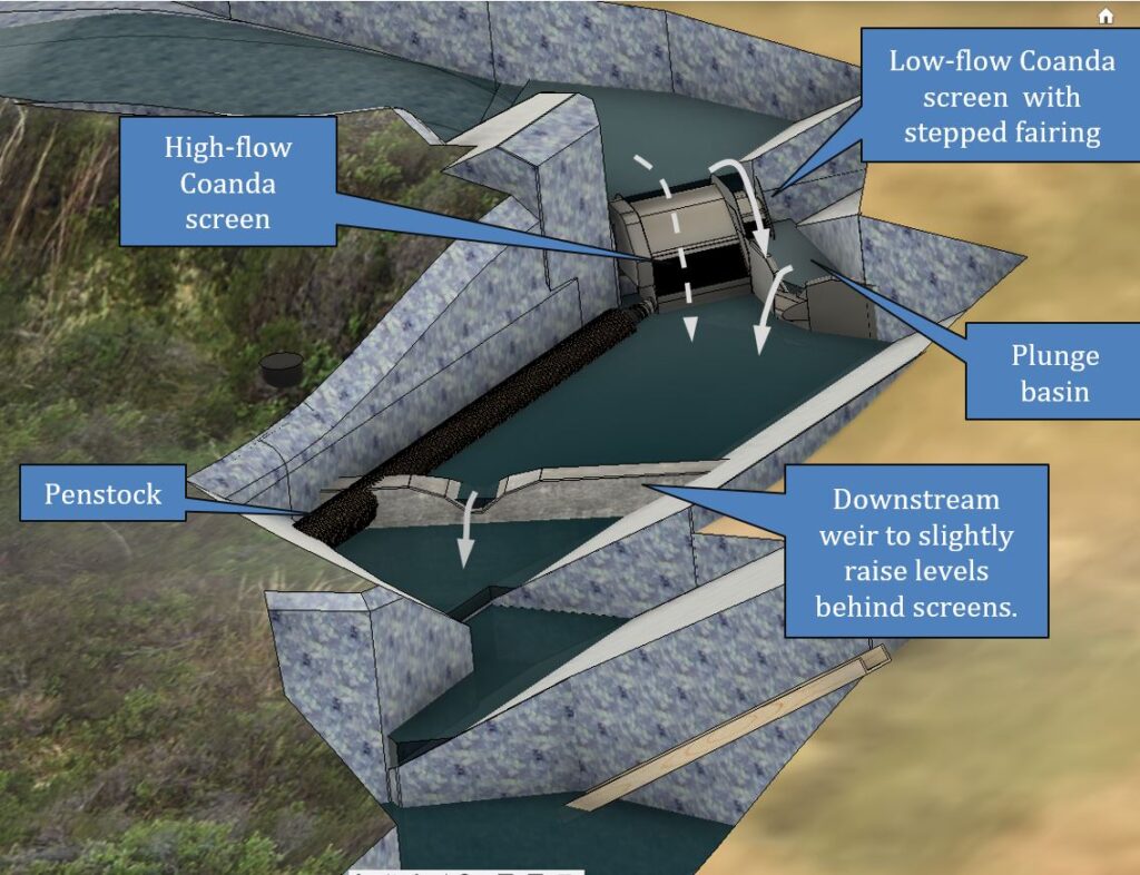 - Extraction component drawings: box assembly, main box, screens, screen + mounting strip, adjustable fairings, sun screen, fish plunge basin. The weir heights have been designed to allow fish to jump up and down past the screens regardless of stream level. The stepped fairings and metering orifice ensure there’s no risk of taking more than a very small fraction of the flow in dry conditions, so the stream cannot be sucked dry.