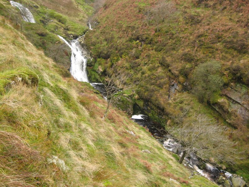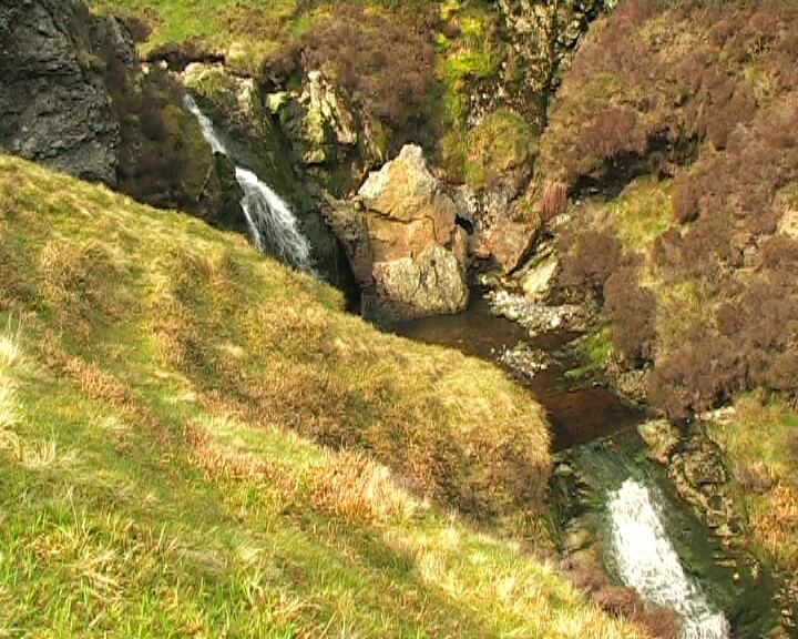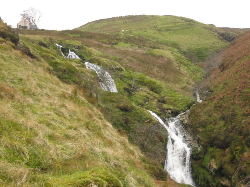 Behind the house, the stream draining the highlands forms a waterfall over a spectacular, overhanging volcanic sill (or dyke) and follows a gorge onwards down the valley. Seasoned scramblers with good boots can go down the steep slopes beside the waterfall and, in dry weather, picnic beside it or dip in the pools – I have even stood under it with a stopwatch and large bucket to measure the flow rate (4 litres/second!). In wet weather though, this section is an awesome, 5 foot deep mass of foam and surging waters at the bottom of a steep and slippery slope.